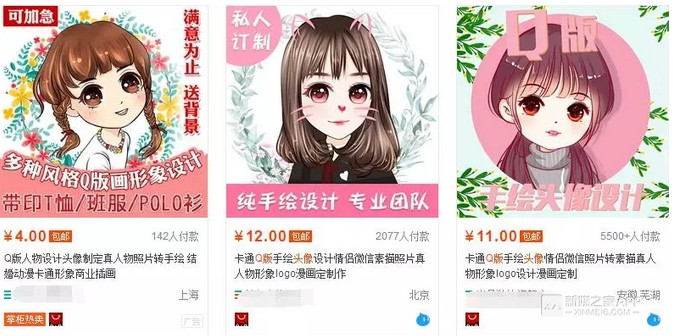 再比如我朋友圈有个画Q版头像的,卖25-35块一张。你猜淘宝多少钱?4-12块!这差价够意思吧?