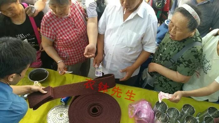 卖刀的也是拼,现场表演砍钢管、刮腿毛。其实只要是没生锈的新刀,这些都不在话下。
