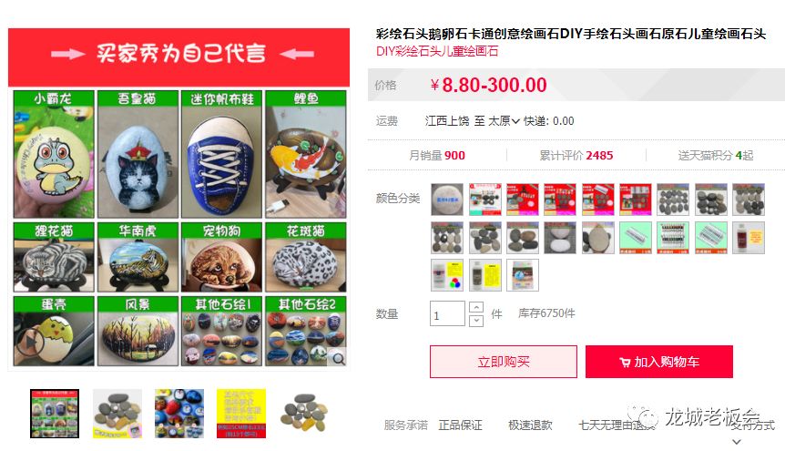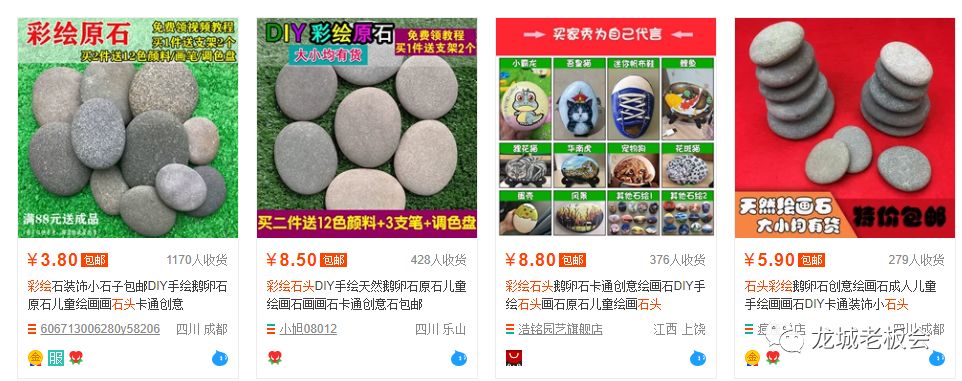 淘宝上更热闹,卖彩绘材料包的店家月销上千单。一套包含石头、颜料、画笔的材料包才卖20块左右,但架不住买的人多啊。这么算下来,光卖材料月入几万根本不是梦。