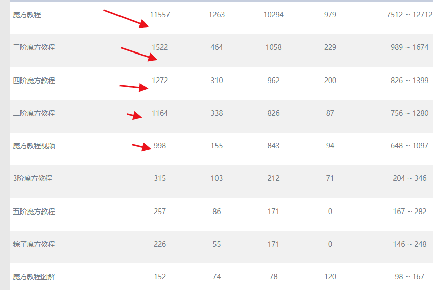 最近实操中,我意外发现了一个被忽视的蓝海领域——魔方教学。通过关键词工具分析,主词"魔方教程"月搜索量破万,细分关键词流量也很可观。这个看似小众的领域,实则暗藏玄机: