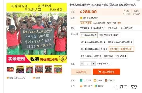 比如搜"非洲儿童生日快乐",就能找到对应的服务商。只要花5美元(不到35元人民币),你就能拿到想要的祝福视频。然后你在淘宝上定价100元以上,这中间的差价就稳稳到手了。除了非洲小朋友,还能定制外国美女的祝福视频,这对单身朋友来说特别有吸引力。