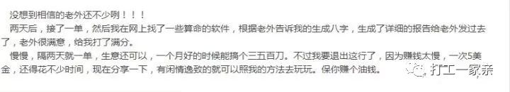 要是觉得前面这些太难操作,还有个更简单的办法。比如我见过有人在fiverr上给老外算命,一个月能赚几百美元。你也可以发挥创意,提供一些有特色的服务。